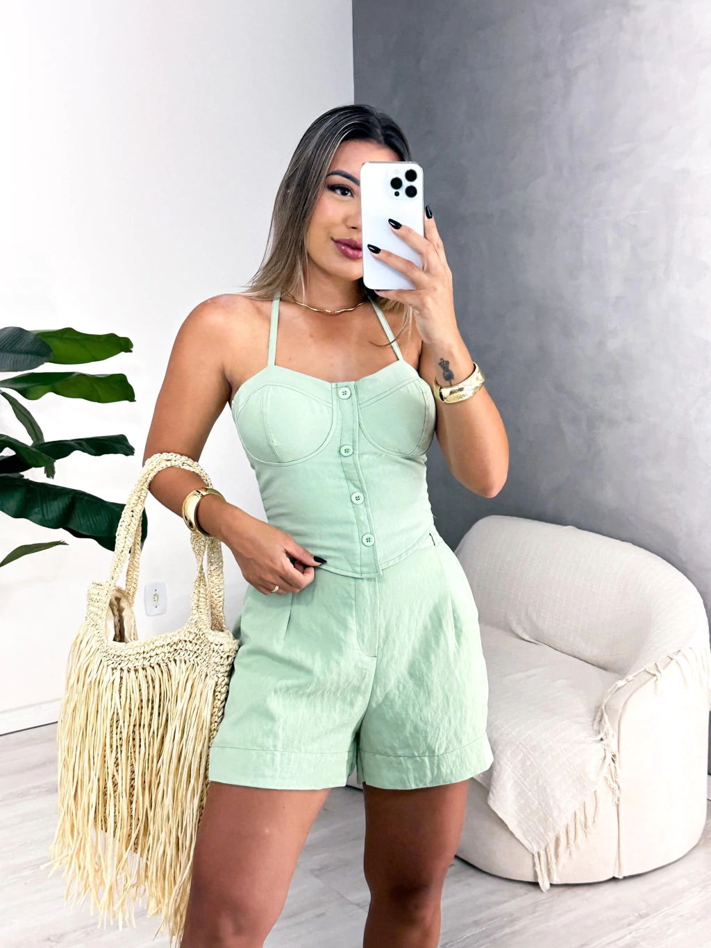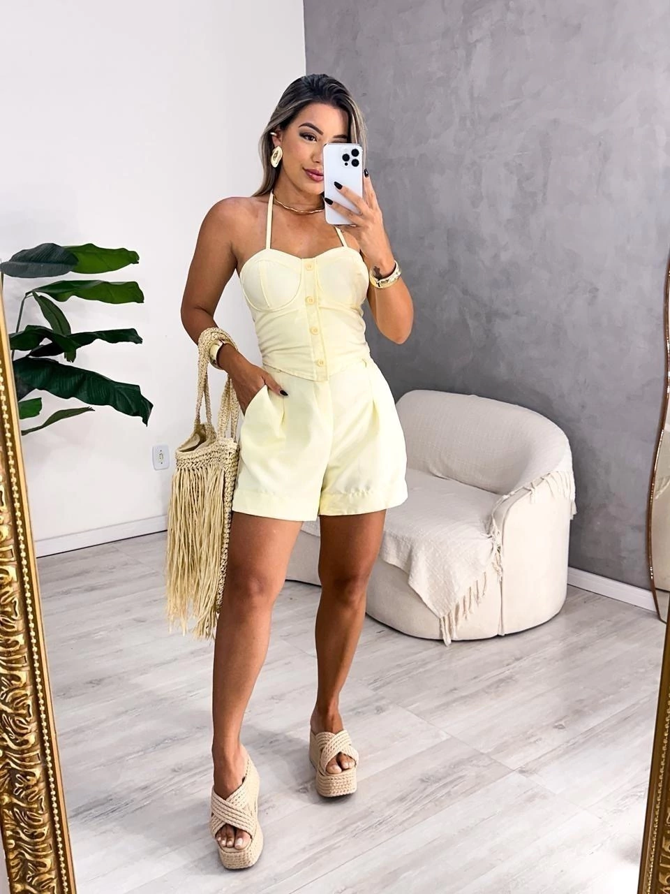 Apresentamos o Conjunto Luana, perfeito para quem busca elegância com toque casual. O cropped traz bojo para sustentação, detalhes com botões fake e amarração no pescoço, garantindo um ajuste confortável e moderno. O lastex nas costas proporciona flexibilidade e caimento impecável.